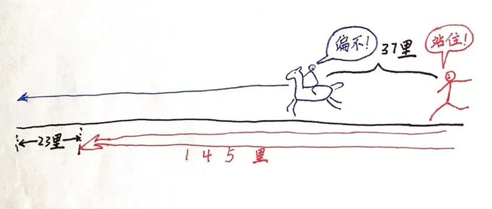 小偷偷了马,跑了37里时,失主才开始追。失主狂追145里(大约77公里),累了不跑了,这时候距离小偷还有23里。请问如果失主有恒心,再跑多远能追到?