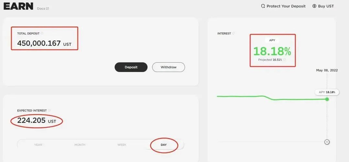 而另一个吸引了无数投资者的项目,便是Terra项目方推出的一个名为Anchor的项目,这个项目相当于一个提供UST存贷款业务的银行。它会为存款者提供高达20%的年化利率,吸引了众多投资者购入UST存入Anchor项目,吃高额的利息。今年25岁的赏金猎人便是其中之一。2021年底,加密货币市场转熊,他存入了8万美元的UST,为的是赚取高额利润。在他看来,把钱存入Anchor是在熊市还能挣钱的不多的方式之一。
