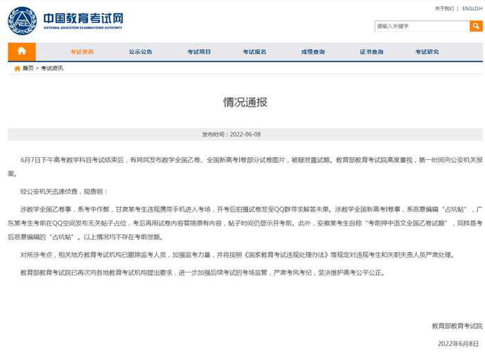 针对上述情况,6月8日,教育部教育考试院发布情况通报称,经公安机关迅速侦查,现查明:涉数学全国乙卷事,系考中作弊,甘肃某考生违规携带手机进入考场,开考后拍摄试卷发至QQ群寻求解答未果,不存在考前泄题。