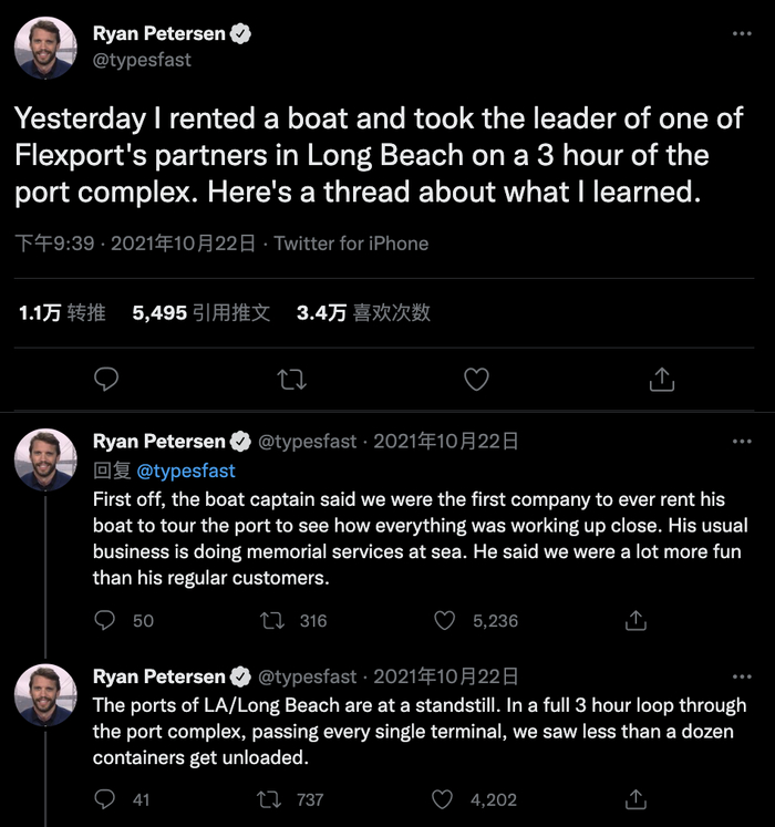 州长回应一出,全民轰动,解决供应链危机Ryan Petersen居功至伟。一位彭博社的专栏作家甚至说,Ryan的一系列推文是“拯救了圣诞节的推特风暴”。事实上,我们知道,美国港口到今天仍在拥堵,加州政府也并未采纳Ryan的政策建议,但这并不影响Ryan本人在网络世界成为航运界的救星。