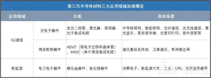 得益于第三代半导体材料的优良特性,它在光电子、电力电子、通讯射频等领域尤为适用。具体来看: