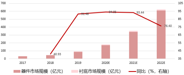 第三代半导体产业究竟掀起了多大的风口?根据《2020“新基建”风口下第三代半导体应用发展与投资价值白皮书》内容:2019年我国第三代半导体市场规模为94.15亿元,预计2019-2022年将保持85%以上平均增长速度,到2022年市场规模将达到623.42亿元。