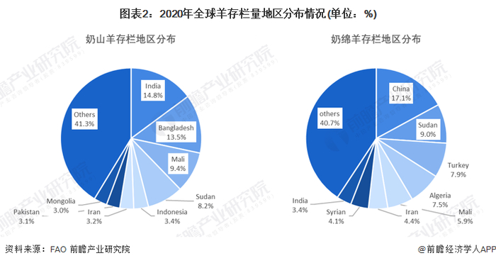 根据FAO统计资料显示,2020年,全球山羊奶产量最大的两大区域分别是亚洲和非洲,二者产量占比分别达到59.2%和21.8%;而全球绵羊奶产量最大的两大区域则分别是亚洲和欧洲,二者产量占比分别为46.3%和29.3%。