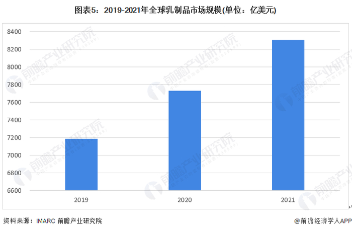 随着人们收入的增加和对乳制品消费观念的转变,全球乳制品的消费人群规模逐年增大,乳制品的消费量也呈明显上升趋势,已经成为城市居民的生活必需品。现阶段,全球乳制品的产量趋于稳定,销售量呈稳步上行趋势。根据IMARC数据显示,2020年全球乳制品市场规模为7729亿美元,经初步统计,2021年全球乳制品市场规模约为8309亿美元,2018-2021年均增速约为7.5%。
