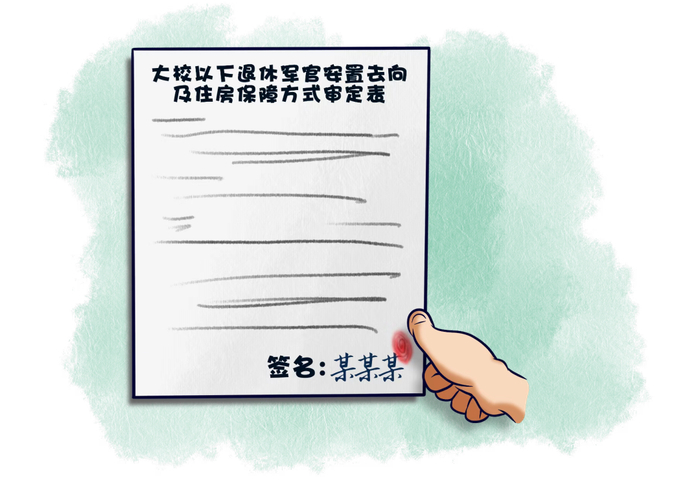 离退休干部根据个人、家庭和现住房情况,选择安置地和住房保障方式,填写《大校以下退休军官安置去向及住房保障方式审定表》,并签字摁印进行确认。