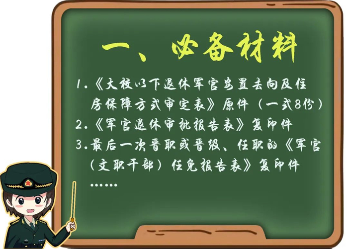 1.《大校以下退休军官安置去向及住房保障方式审定表》原件(一式8份)