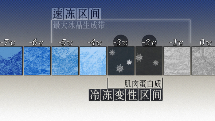 ﹣1℃到﹣5℃,正好包括肌肉蛋白质冷冻变性的最快温度区间(﹣2℃到﹣3℃),所以速冻也能减轻肌肉蛋白质的变性。比如肌肉蛋白质之一的肌原纤维,在速冻状态下,持水能力维持更好,也就是说更鲜嫩有光泽。