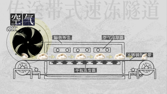 这是一台常见的传送带式速冻隧道,成本低、自动化程度高,缺点是可能会有冷风把饺子吹走的尴尬场面,占地面积也比较大。