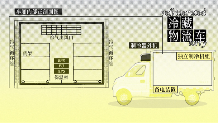 这是一台你在路上经常看到的物流车。车厢的前方装有制冷器,两边的侧板装有冷气循环管,四周装有隔热的保温棉,一般选取发泡性聚苯乙烯(EPS)、PU或者XPS材质。