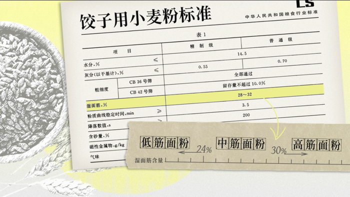 根据这份推荐性国家标准,饺子皮所用的面粉,推荐湿面筋含量在28%-32%之间,大致属于推荐性国标规定的中筋到高筋面粉。低筋粉做的饺子馅容易破皮,速冻后容易开裂;面筋含量太高的话,饺子虽然不裂,但口感可能太硬。
