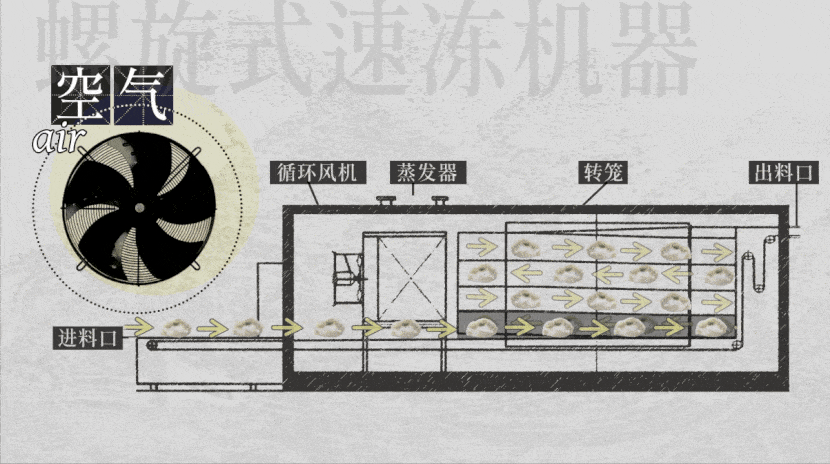 你也可以让传送带卷起来,变成这样的螺旋式,只需要原来面积的四分之一。食物从下往上转,冷风形成循环,饺子也不会乱跑。