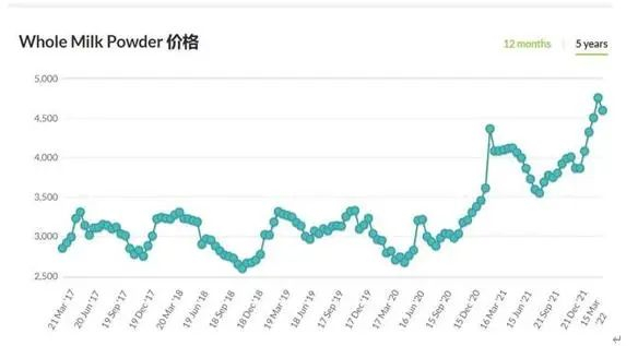 据第一财经报道,在全球乳制品拍卖中,全脂奶粉平均中标价2021年9月为3552美元/吨,2022年3月1日涨至4757美元/吨,达到近8年历史高位。