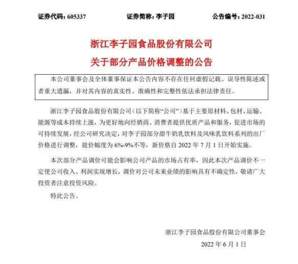 儿童节这天,“甜牛奶第一股”李子园宣布:部分甜牛奶乳饮料及风味乳饮料系列的出厂价调整,提价幅度 6%-9%不等,新价2022年7月1日实施。