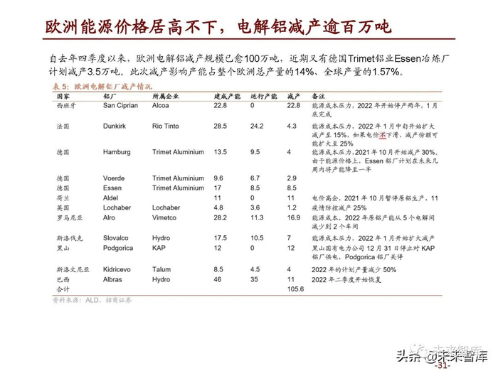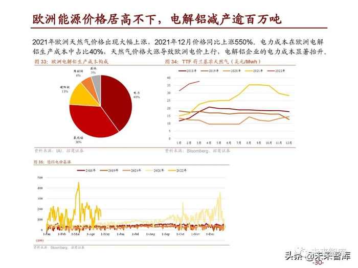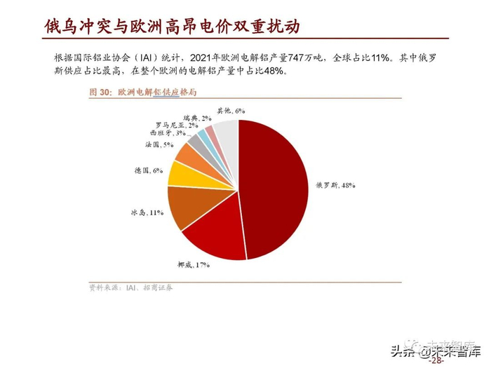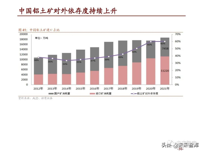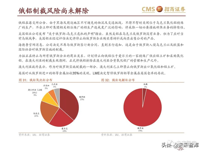 几内亚:新军事政权有奉行“资源民族主义政策”的迹象,要求矿业公司2022年5月之前提交 氧化铝建设计划,否则将会受到相应惩罚。几内亚的铝土矿在中国进口占比高达51%,若后续 限制出口,对中国电解铝生产扰动较大。但当地又不具备氧化铝生产配套原料,只能从其他地 方进口,这势必导致在当地建氧化铝厂的生产成本高昂,进而限制国内电解铝的生产。(报告来源:未来智库)