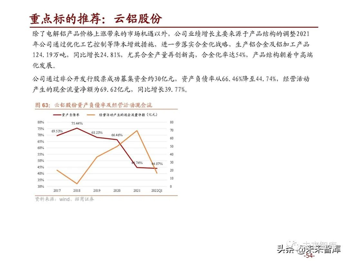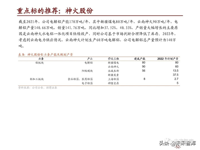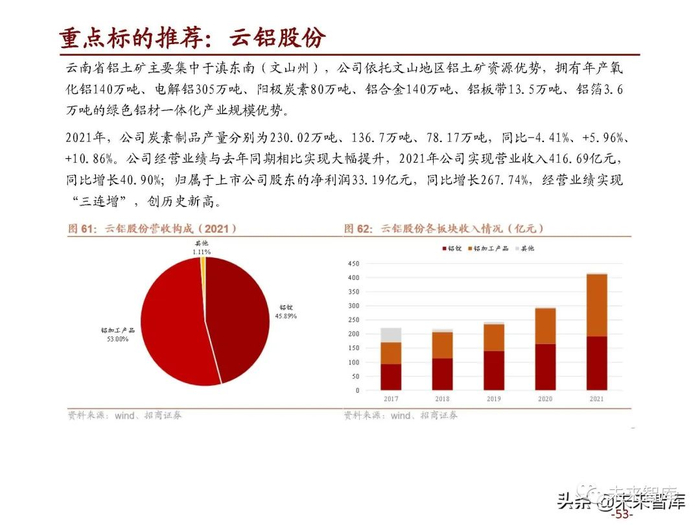 云南省铝土矿主要集中于滇东南(文山州),公司依托文山地区铝土矿资源优势,拥有年产氧 化铝140万吨、电解铝305万吨、阳极炭素80万吨、铝合金140万吨、铝板带13.5万吨、铝箔3.6 万吨的绿色铝材一体化产业规模优势。2021年,公司炭素制品产量分别为230.02万吨、136.7万吨、78.17万吨,同比-4.41%、+5.96%、 +10.86%。公司经营业绩与去年同期相比实现大幅提升,2021年公司实现营业收入416.69亿元, 同比增长40.90%;归属于上市公司股东的净利润33.19亿元,同比增长267.74%,经营业绩实现 “三连增”,创历史新高。