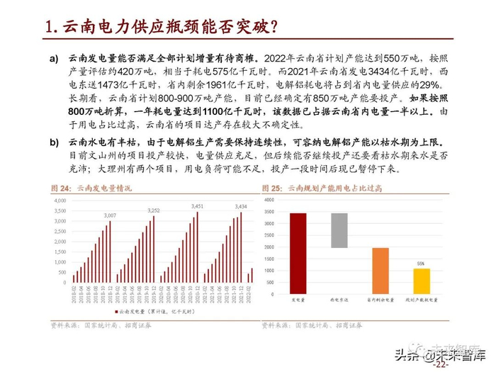 云南发电量能否满足全部计划增量有待商榷。2022年云南省计划产能达到550万吨,按照 产量评估约420万吨,相当于耗电575亿千瓦时。而2021年云南省发电3434亿千瓦时,西 电东送1473亿千瓦时,省内剩余1961亿千瓦时,电解铝耗电将占到省内电量供应的29%。长期看,云南省计划800-900万吨产能,目前已经确定有850万吨产能要投产。如果按照 800万吨折算,一年耗电量达到1100亿千瓦时,该数据已占据云南省内电量一半以上。由 于用电占比过高,云南省的项目达产存在较大不确定性。