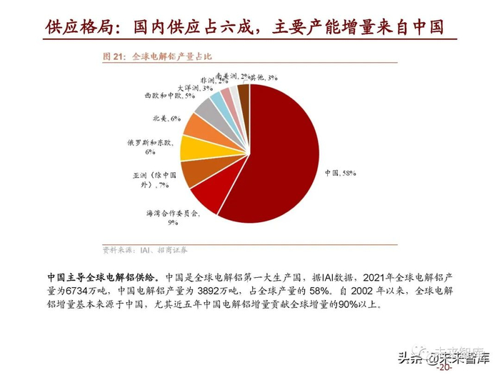 中国主导全球电解铝供给。中国是全球电解铝第一大生产国,据IAI数据,2021年全球电解铝产 量为6734万吨,中国电解铝产量为 3892万吨,占全球产量的 58%。自 2002 年以来,全球电解 铝增量基本来源于中国,尤其近五年中国电解铝增量贡献全球增量的90%以上。