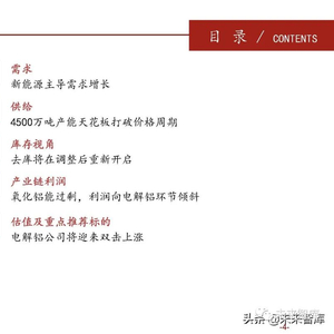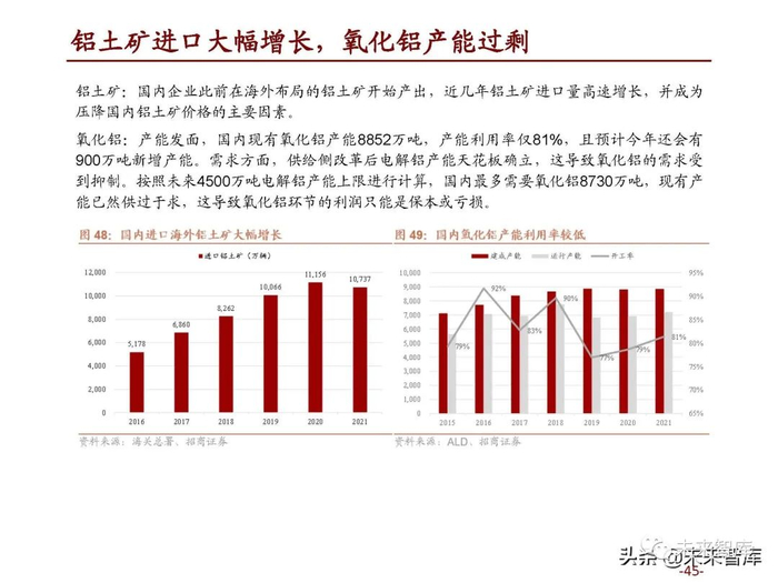 氧化铝:产能发面,国内现有氧化铝产能8852万吨,产能利用率仅81%,且预计今年还会有 900万吨新增产能。需求方面,供给侧改革后电解铝产能天花板确立,这导致氧化铝的需求受 到抑制。按照未来4500万吨电解铝产能上限进行计算,国内最多需要氧化铝8730万吨,现有产 能已然供过于求,这导致氧化铝环节的利润只能是保本或亏损。