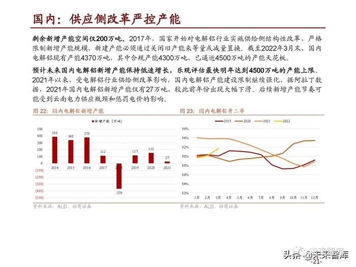 剩余新增产能空间仅200万吨。2017年,国家开始对电解铝行业实施供给侧结构性改革,严格 限制新增产能规模,新建产能必须通过关闭旧产能来等量或减量置换。截至2022年3月末,国内 电解铝现有产能4370万吨,其中合规产能4300万吨,已逼近4500万吨的产能天花板。