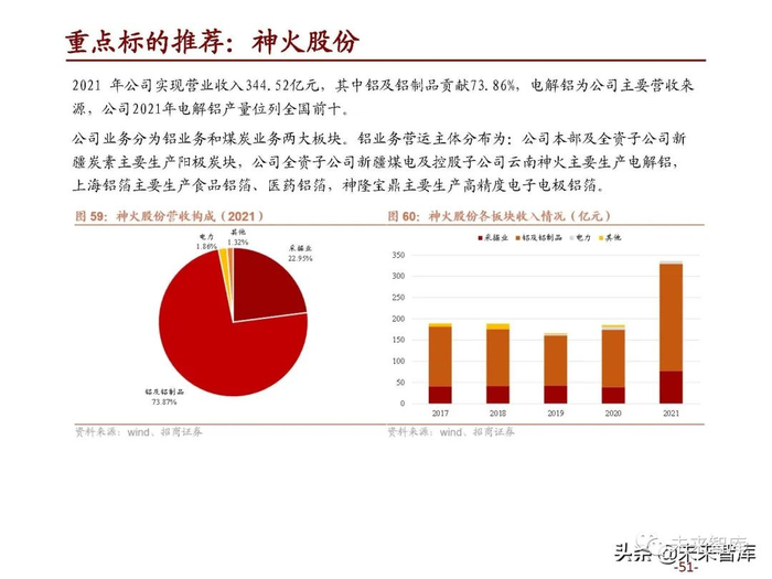 2021 年公司实现营业收入344.52亿元,其中铝及铝制品贡献73.86%,电解铝为公司主要营收来 源,公司2021年电解铝产量位列全国前十。公司业务分为铝业务和煤炭业务两大板块。铝业务营运主体分布为:公司本部及全资子公司新 疆炭素主要生产阳极炭块,公司全资子公司新疆煤电及控股子公司云南神火主要生产电解铝, 上海铝箔主要生产食品铝箔、医药铝箔,神隆宝鼎主要生产高精度电子电极铝箔。