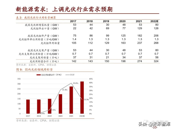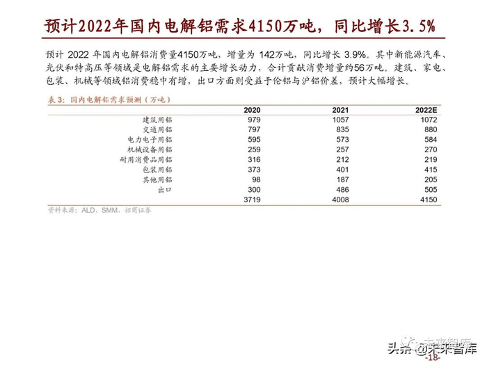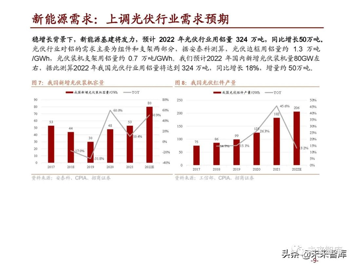 稳增长背景下,新能源基建将发力,预计 2022 年光伏行业用铝量 324 万吨,同比增长50万吨。光伏行业对铝的需求主要为组件和支架两部分,据安泰科测算,光伏边框用铝量约 1.3 万吨 /GWh,光伏装机支架用铝量约 0.7 万吨/GWh。我们预计2022 年国内新增光伏装机量80GW左 右,据此测算2022 年我国光伏行业用铝量将达到 324 万吨,同比增长 18%,增量约 50万吨。