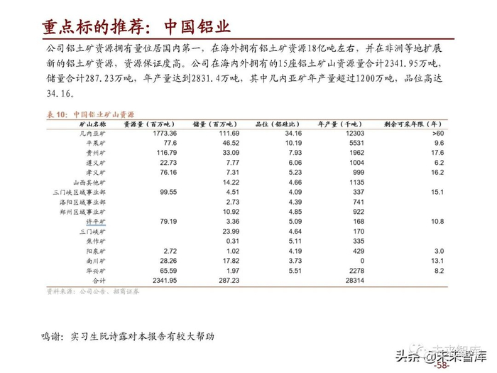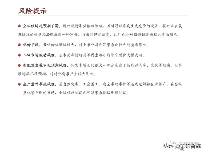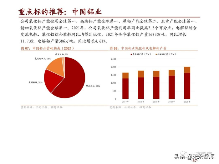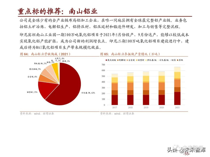 公司是全球少有的全产业链布局铝加工企业,在唯一同地区拥有全球最完整铝产业链。业务包 括铝土矿冶炼、电解铝生产、铝挤压材、铝压延材和锻造件研发、加工与销售等完整流程。印尼宾坦南山工业园一期100万吨氧化铝项目于2021年5月份投产、9月份达产,能够以较低成本 实现氧化铝产能扩张,成为公司新的利润增长点。印尼二期100万吨氧化铝项目建设进行中,建 成后将为BAI氧化铝项目生产带来规模化效益。