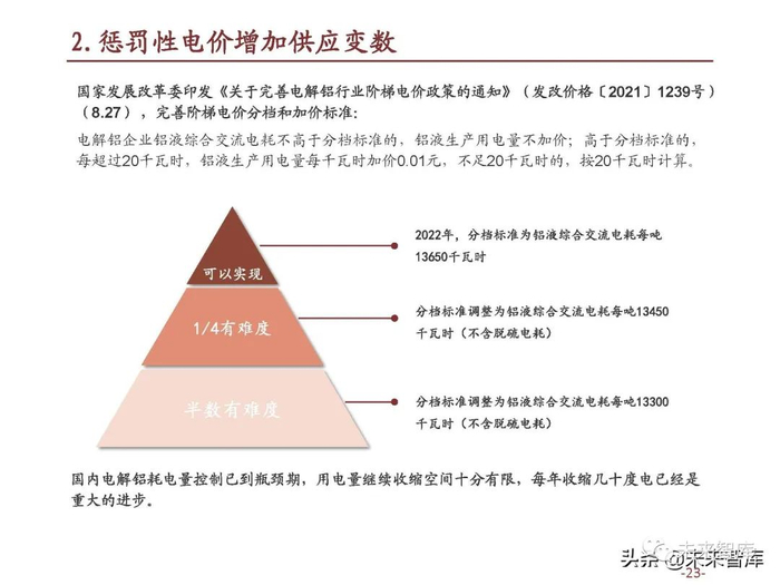 国家发展改革委印发《关于完善电解铝行业阶梯电价政策的通知》(发改价格〔2021〕1239号) (8.27) ,完善阶梯电价分档和加价标准:电解铝企业铝液综合交流电耗不高于分档标准的,铝液生产用电量不加价;高于分档标准的, 每超过20千瓦时,铝液生产用电量每千瓦时加价0.01元,不足20千瓦时的,按20千瓦时计算。