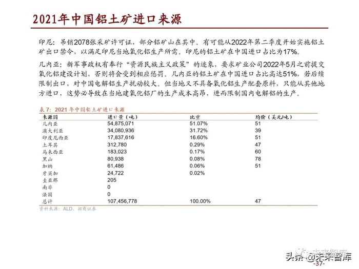 印尼:吊销2078张采矿许可证,部分铝矿山在其中。有可能从2022年第二季度开始实施铝土 矿出口禁令,以满足印尼当地氧化铝生产所需。印尼的铝土矿在中国进口占比为17%。