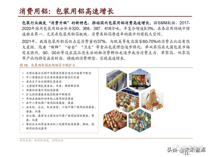 包装行业焕发“消费升级”的新特色,推动国内包装用铝消费高速增长。据SMM数据,2017- 2020年国内包装用铝分别为320、368、387、418万吨,年复合增速9.3%,在各应用领域中增 速排名第一。尤其在包装用铝箔板块,消费类铝箔渗透率的提升仍有较大空间。