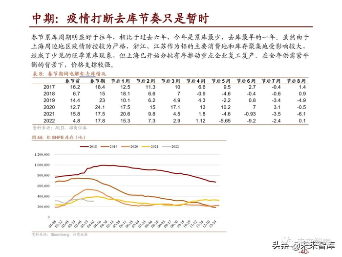 春节累库周期明显好于往年,相比于过去六年,今年是累库最少,去库最早的一年。虽然由于 上海周边地区疫情防控较为严格,浙江、江苏作为铝的主要消费地和库存聚集地受影响较大, 造成了少见的旺季累库现象,但上海已开始分批有序推动重点企业复工复产。在全年供需紧平 衡的背景下,价格支撑较强。
