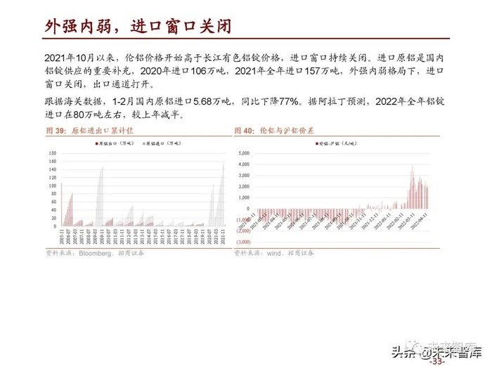 2021年10月以来,伦铝价格开始高于长江有色铝锭价格,进口窗口持续关闭。进口原铝是国内 铝锭供应的重要补充,2020年进口106万吨,2021年全年进口157万吨,外强内弱格局下,进口 窗口关闭,出口通道打开。跟据海关数据,1-2月国内原铝进口5.68万吨,同比下降77%。据阿拉丁预测,2022年全年铝锭 进口在80万吨左右,较上年减半。