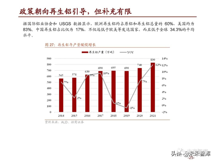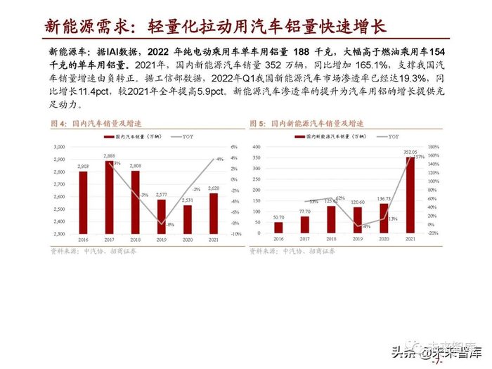 新能源车:据IAI数据,2022 年纯电动乘用车单车用铝量 188 千克,大幅高于燃油乘用车154 千克的单车用铝量。2021年,国内新能源汽车销量 352 万辆,同比增加 165.1%,支撑我国汽 车销量增速由负转正。据工信部数据,2022年Q1我国新能源汽车市场渗透率已经达19.3%,同 比增长11.4pct,较2021年全年提高5.9pct。新能源汽车渗透率的提升为汽车用铝的增长提供充 足动力。