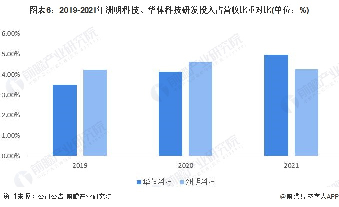 2019-2021年,洲明科技研发投入占营业收入比重在4-5%左右,占比呈波动趋势;华体科技研发投入占营业收入比重为3-5%左右,呈上升趋势。整体来看,华体科技研发占比高于洲明科技。