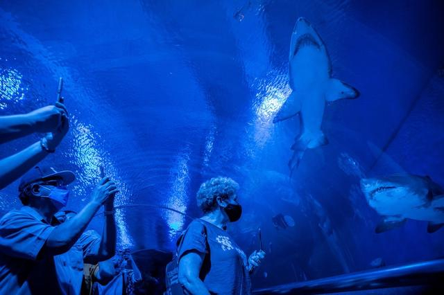 当地时间2022年6月8日,马来西亚吉隆坡 ,世界海洋日之际,两名表演者穿着美人鱼服装在KLCC水族馆的主水族馆游泳。