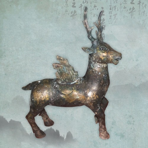 鹿在古代被视为神物,人们认为鹿能带来吉祥幸福和长寿,那些长寿神就是骑着梅花鹿。在商代鹿骨用作占卜,殷虚还发现鹿角刻辞。东周时期,楚墓中流行使用本雕镇墓鸟兽神怪,它们的头上都安装真实的鹿角,形成楚文化的特点。该铜鹿为青铜铸造,中空。表面布满铜锈,鹿双耳竖立,颈部挺拔,短尾翘起,四蹄奔腾,背生双翅,仿佛随时就可腾空而起。
