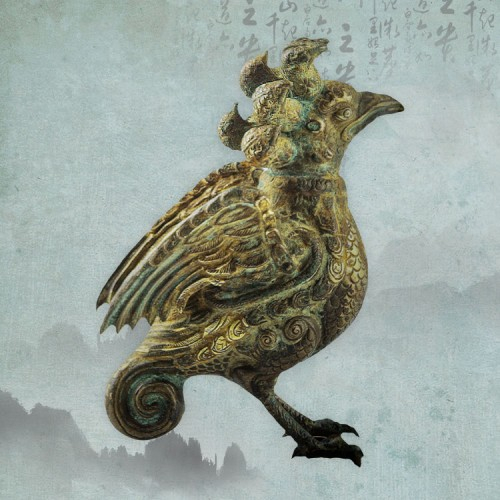 九头鸟出自神话小说《山海经》和《楚辞》,是中国神话传说中的怪鸟。九头鸟同时是周代楚国先民的图腾崇拜。早期的九头鸟是凤鸟的形象之一,是周代楚国祥瑞的吉兆,美好情感的载体。这件铜鎏金九头鸟就是对于文化很好的延续运用盛唐时期成熟的金银器制作工艺,完美的把上古神话传说中的圣鸟形象展示出来。