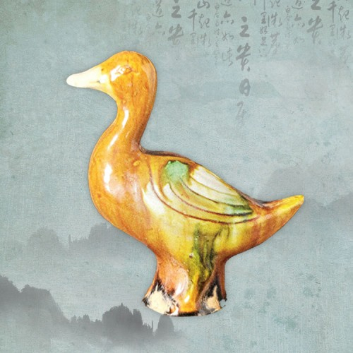 辽三彩是辽代所生产的一种低温彩色釉陶制品,它常常选用黄、绿、褐三种颜色的釉,应当说是受到了唐三彩的深深影响。辽三彩的胎质比较粗,并且很硬,颜色是呈现出灰黄白色或者是淡红色的。辽三彩拥有非常鲜明的时代特征,虽然继承唐三彩,但也有自己的创新发展。此件辽三彩鸭通体施深绿及深、浅黄釉,浓淡相间,绚丽多彩,造型别致生动,玲珑有致。是仿生陶器中的杰作。