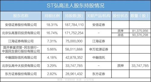 年报信息显示,2021年,安信证券通过司法划转弘高中太156603710股;江海证券司法划转弘高慧目65000000股,划转弘高中太10000000股;申万宏源证券司法划转弘高中太58011888股;东方证券也是因为股权质押进入了股东行列。