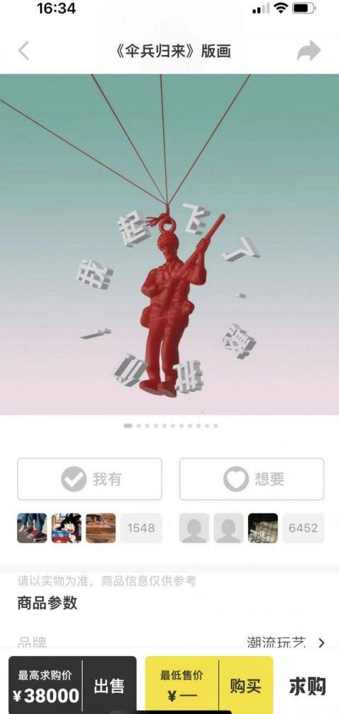 比如,《伞兵归来》版画最初的发售价格仅为19.9元,但截止目前最高求购价已涨至38000元,溢价1900余倍,且成交记录3286单。另一款《pinication盖章》的徽章发售最初的价格为99元,目前成交价格多为38000元,产品溢价380倍,成交量2342余单,尚有6107人求购。