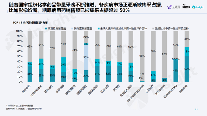 随着国家集采进入到不断扩围的常态化实施阶段,入围品种数量不断扩大,迄今六批集采已覆盖 234 种药品。各疾病市场正逐渐被集采药物所占据,例如「4+7」至今,降脂药领域集采品种已占据 75% 的市场,且整体市场规模已缩水 50%。影像诊断、糖尿病用药销售额也已被集采占据超 50%。