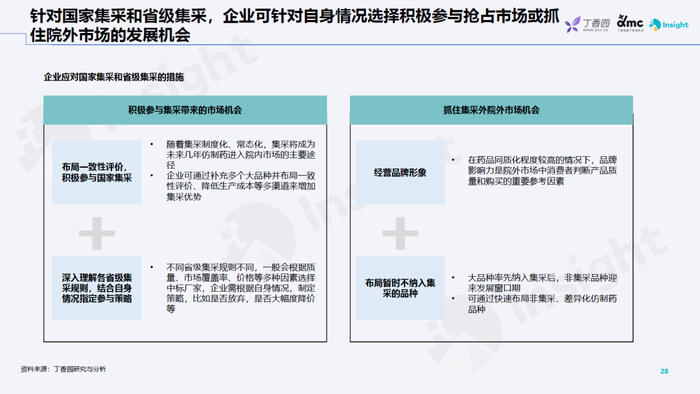 面对集采带给医药行业的颠覆性改变,企业必须积极因应方能尽快度过「阵痛期」并找到突围之道。鉴于此,建议企业一方面可以通过补充大品种,布局一致性评价,积极参与国家集采,并根据自身情况制定省级集采的参与策略;另一方面也可以聚焦于集采未覆盖的院外市场,在打造与经营品牌形象,影响消费者购买取向的同时,瞄准暂时不纳入集采的品种,抓住非集采品种发展的窗口期。