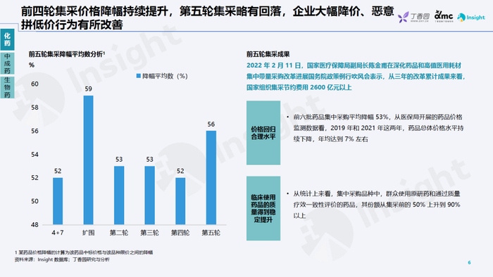 在此基础上,国家启动带量集采,截止目前,带量集采已进行六批七轮。第七批正在进行企业信息填报,频率逐渐稳定在一年两轮。数据显示,前六批药品集中采购平均降幅 53%,而且 2019 年和 2021 年这两年,药品总体价格水平呈持续下降态势,年均达到 7% 左右,较好实现了引导药品价格回归合理水平的目的。