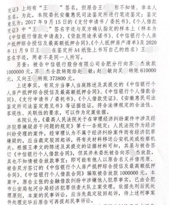 王阳将中信银行告上法庭。根据《安徽省合肥市包河区人民法院民事裁定书》显示,经司法鉴定,部分合同的签名笔迹并非王阳本人所写。法院审理认定,该金融借款纠纷涉嫌他人犯罪事实,已由合肥市公安局包河分局经济犯罪侦查大队立案受理。