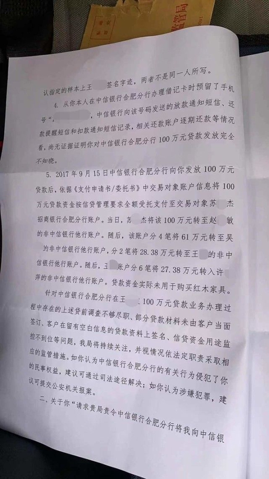针对此事,银保监部门认为,中信银行合肥分行在王阳100万元贷款业务办理过程中,存在贷前调查不够尽职、部分贷款材料未由客户当面签订、客户在留有空白信息的贷款资料上签名、信贷资金用途监控不到位等问题,“我局将持续关注,并视情况依法定职责采取相应的监管措施。”该部门建议,王阳可以通过司法途径维权民事权益,若涉嫌犯罪,可向公安机关报案。