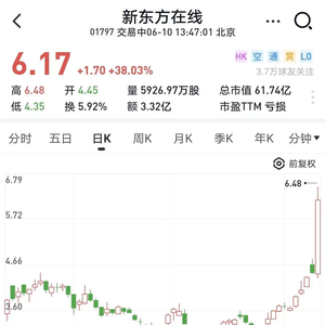 今天上午,港股开盘后,新东方在线一路拉涨,从10%到20%,再到盘中涨超30%,40%,令人惊叹不已。从5月低点2.84港元/股来算,短短一个月时间,新东方在线的股价已经翻倍有余。