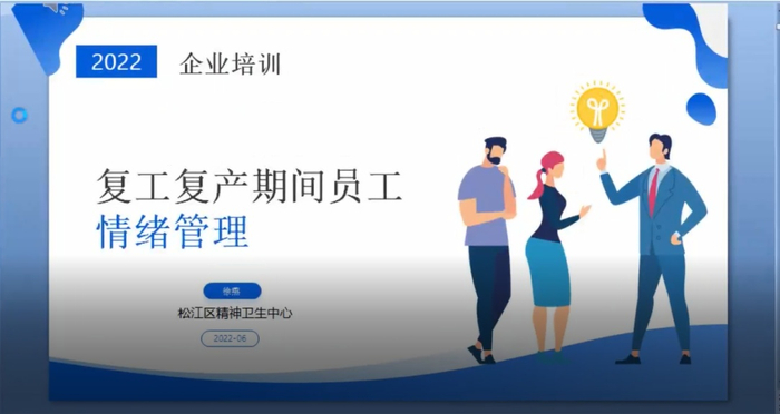 该课程从情绪的作用、产生不良情绪的原因、情绪管理方法等5个方面进行了细致讲解。“让职工们识别自身的情绪问题,然后尝试去合理调节。”视频主讲人、区精神卫生中心副院长徐燕表示,复工复产的同时,职工的心理健康需重视,心理焦虑越早化解越好。