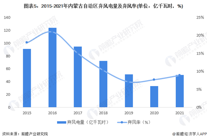 不过,内蒙古在近几年加大风能消纳能力,2017-2020年内蒙古弃风电量及弃风率呈现下滑趋势。2020年,内蒙古弃风电量及弃风率分别为33亿千瓦时和7.7%,2021年,内蒙古弃风量和弃风率有一定程度的回升,分别达到了50.6亿千瓦时和8.9%,但较早年相比已经有了较大程度的改善。