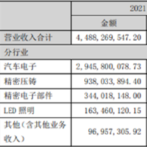 2021年,公司主要业务汽车电子及精密压铸营业收入均实现增长,其中汽车电子实现营业收入29.46亿元,较上年同期增长39.88%,精密压铸实现营业收入9.38亿元,较上年同期增长47.55%。其他业务LED照明实现营业收入1.63亿元,较上年同期增长15.31%,精密电子部件实现营业收入3.44亿元,较上年同期下降12.26%。