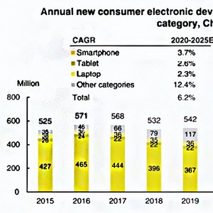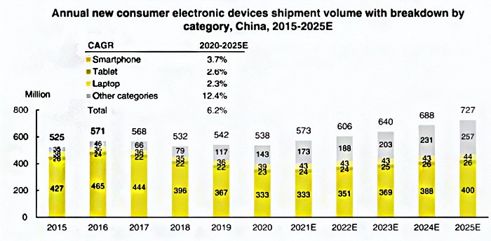据灼识咨询(CIC)报告数据显示,从市场规模来看,2020年中国消费电子产品销售额达1.9万亿元,预计2025年将达到2.97万亿元,年复合增长率达9.3%。整体而言,消费电子呈现出蓬勃之势,市场的火热也在一定程度上带动了3C配件产业的发展。