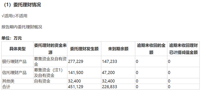 2021年3月31日,公司计划使用不超过50亿元购买理财产品。2021年报显示,公司在本年度委托理财发生额合计达45.11亿元,基本上使用了规定额度上限。